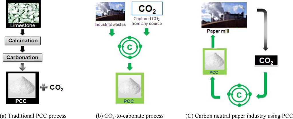 Expensive raw materials and a large amount of energy were consumed in the traditional PCC manufacture process, and large amounts of CO2 gas were also produced [Figure 15(a)]. On the other hand, a new PCC production process, which is called ‘CO2-to-Carbonate technology’, uses inexpensive raw materials such as waste materials from industrial operations and emitted CO2, consumes less energy, and decreases CO2 by converting it into PCC [Figure 15(b)]. Kakizawa et al. [42] suggested an alternative method to CaCO3 for CO2 sequestration, which is based on extraction of calcium from wollastonite (CaSiO3) mineral using acetic acid. Applying this concept to PCC, Teir et al. [40] showed that manufacturing PCC through the traditional method will emit CO2 as much as 0.21 kg/kg PCC, which assumes oil combustion for lime calcinations, whereas the acetic acid method using wollastonite (CaSiO3) will give a net fixation of 0.34 kg CO2/kg PCC [41]. A paper mill plant integrated with CO2-to-Carbonate process can transform its CO2 emissions into PCC used in paper manufacture, so that the process can be one step closer to carbon neutrality [Figure 15(C)].