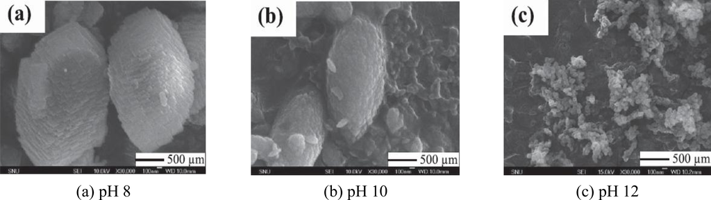 Scanning electron microscope (SEM) images of CaCO3 precipitated at various pHs with the addition of NH4OH (from Ahn et al. [49] with permission of Resources Processing).