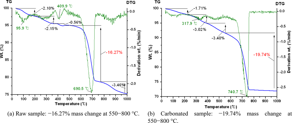 As mentioned, a variety of research on carbonation has been performed worldwide. It is well known that thermo-gravimetric (TG) analysis is one of the most widely used methods for quantitative evaluation of CO2 in carbonated products. The analysis is based on measuring the mass change of a sample caused by heat at temperatures in various ranges. The mass change can be attributed to moisture evaporation or chemical breakdown of compounds into gaseous components [53]. Various temperature ranges (°C) of CaCO3 decomposition reported in previous studies are shown in Table 5 [53].