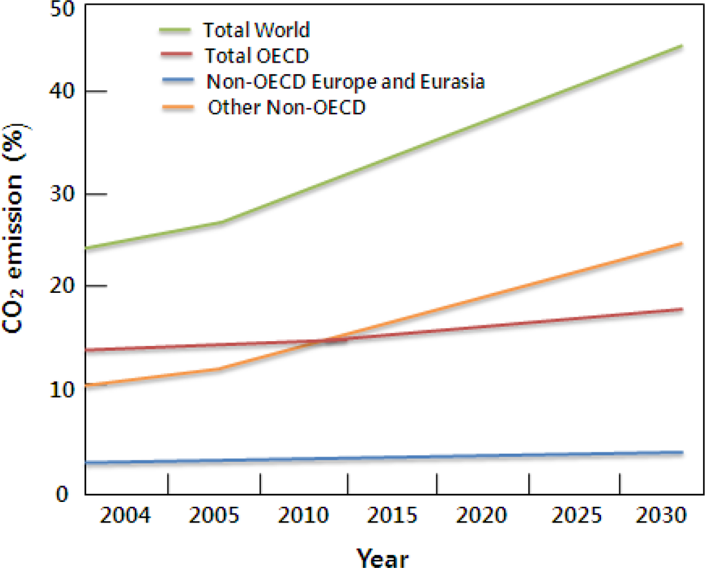 The U.S. Energy Information Administration has stated that greenhouse gases emissions primarily come from the combustion of fossil fuels in energy use. The energy use is largely accompanied by economic growth with short-term fluctuations in its growth rate created by weather patterns affecting heating and cooling needs, as well as changes in the fuel used in electricity generation. As shown in Figure 1, energy-related CO2 emissions, resulting from the combustion of petroleum, coal, and natural gas, represented 82% of total U.S. anthropogenic greenhouse gas emissions in 2006 [2]. An annual increase rate in world CO2 emissions between 2004 and 2030 is expected to be 1.8% (Figure 2). Much of the increase in these emissions is considered to occur in the developing world such as China and India by fuel economic development with fossil energy. The emissions from the countries outside the Organization for Economic Cooperation and Development (OECD) are expected to grow above the world average at annual 2.6% between 2004 and 2030 [3].