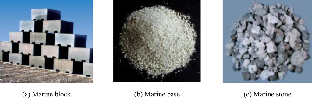 JFE Steel Corporation in Japan has successfully developed new environmentally-friendly materials made from steel slag. They manufactured three materials from steelmaking slag: an artificial reef for seaweed/coral breeding (Marine Block), a sand-capping material (Marine Base), and a submerged embankment (Marine Stone), as shown in Figure 20 [64].