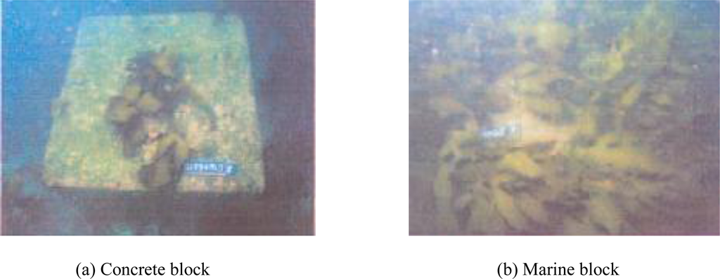 Comparison of seaweed adhesion to normal concrete and marine concrete: more seaweeds were adherent to marine block than concrete block (JFE Steel [64]).