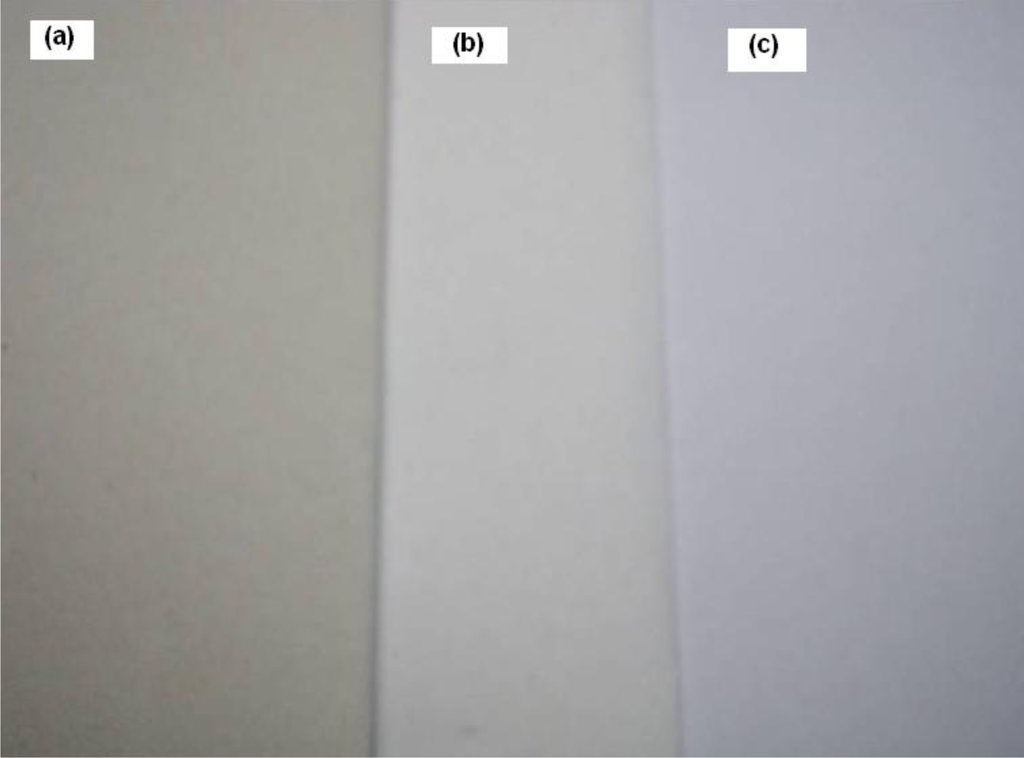 Photos of the recycled papers made from three kinds of waste pulp [(a) old newspaper, (b) white ledger, and (c) printing paper] through in-situ process with PCC (10% calcite): whiteness order (a) < (b) < (c) (unpublished photo).