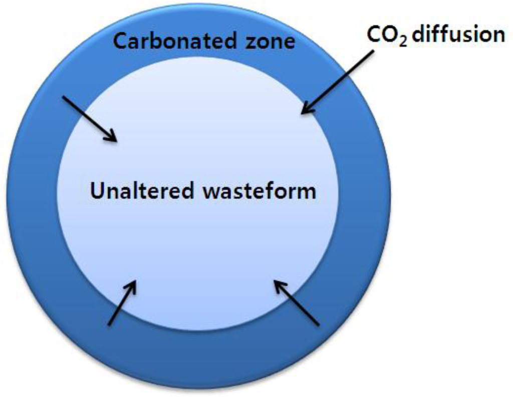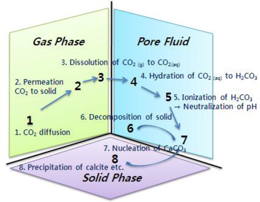 Carbonation is a strongly exothermic reaction and calcium carbonate (CaCO3) is formed by the reaction between cementitious materials and CO2 through eight steps, as shown in Figure 3 [11,12]. In general, carbonation is a diffusion-controlling reaction in which the outside surface of the solid is firstly carbonated by the diffusion of CO2 into the inner region of the solid and the carbonated area then becomes larger and larger, as shown in Figure 4 [13].