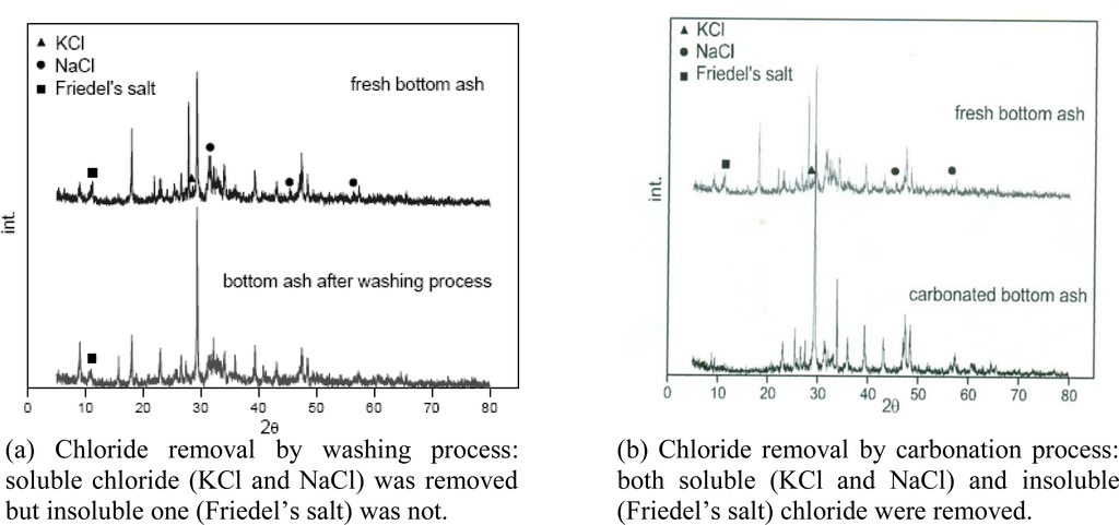 For the removal of chloride from MSWI bottom ash, we could effectively remove soluble chlorides by a washing process with water, but the process was ineffective for insoluble chloride removal, as shown in Figure 6(a) [26]. However, the accelerated carbonation process was very effective for removing both soluble and insoluble chlorides, as shown in Figure 6(b). Equation (7) expresses the carbonation process of Friedel’s salt [24]: