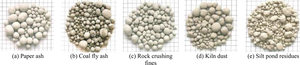 Besides MSWI bottom ash, a study on carbonation using alkaline paper mill waste in high Ca content was performed by Perez-Lopez et al. [31]. They investigated the aqueous carbonation mechanisms of an alkaline paper mill waste containing about 55 wt% portlandite [Ca(OH)2], as a possible mineralogical CO2 sequestration process. They revealed that according to the experimental protocol, the system would capture approx. 218 kg of CO2 into stable calcite per one ton of paper waste, independently from initial CO2 pressure, and the final product from the carbonation process is a calcite (ca. 100 wt%)-water dispersion [31]. Figure 7(a)−(e) shows aggregates manufactured from various industrial wastes including paper mill ash by the carbonation process [32].