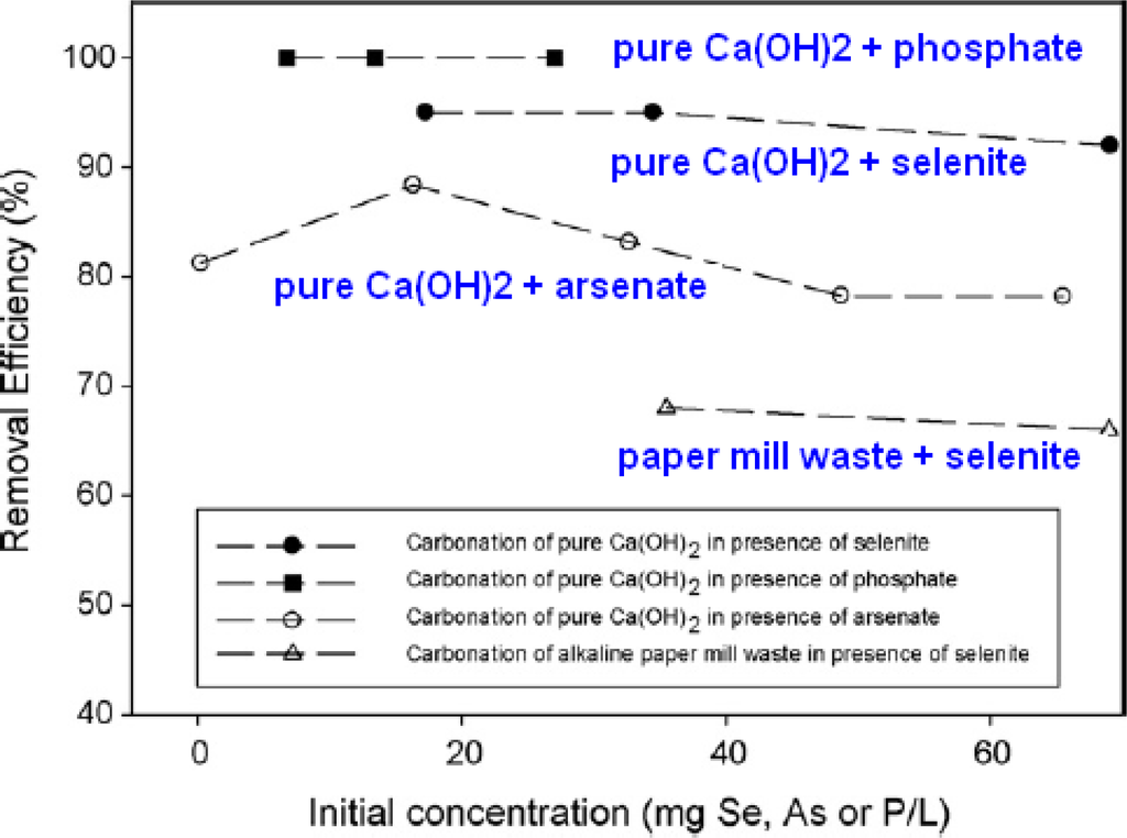 Removal efficiency of selenite, arsenate and phosphate by Ca(OH)2 carbonation with compressed CO2 (from Montes-Hernandez et al. [34] with permission of Elsevier).