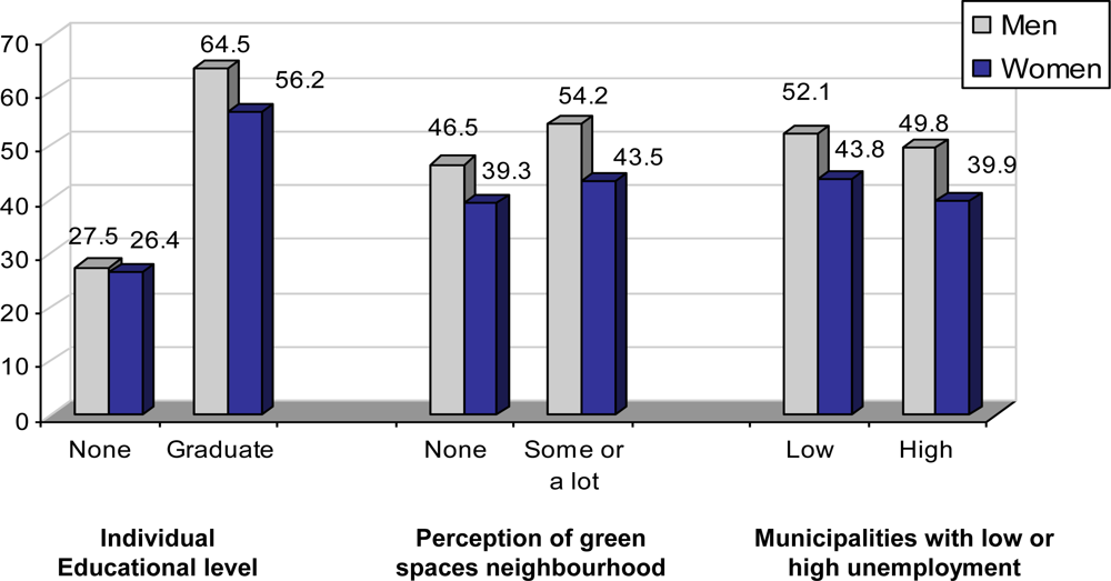 Furthermore, both men and women’s perception of green spaces in their neighbourhood has an influence on rates of physical activity. With regard to physical activity, social class is still prevalent in the physical context, since people from higher social classes and with higher qualifications who consider that their neighbourhoods have many green spaces engage in more physical activities (data not shown).
