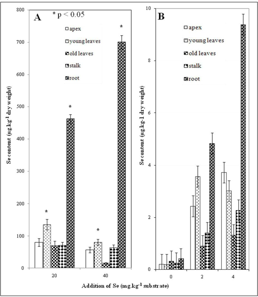 Selenium content in roots increased linearly with the amount of Se applied (Figure 2). Growth of above-ground plant parts and root stagnated in connection with increasing selenium concentration. Selenium concentrations in roots of all treated plants significantly exceed the amounts in other plant tissues (Figure 2). Application of 20 mg Se per kg of soil resulted in considerable a selenium content increase in all above-ground plant parts (Figure 2A). Lower Se content in the above-ground parts of plants was observed for the addition of 40 mg Se per kg of soil in comparison with application of 20 mg Se/kg (Figure 2A). This effect is probably connected with the higher expression of metal-binding proteins such as glutathione and phytochelatins [25,29,30]. In c ase of one-shot doses, equal selenium concentrations were found in plants treated with 2 mg Se/kg (variant 2) as in plants treated with 4 mg Se/kg (Figure 2B).