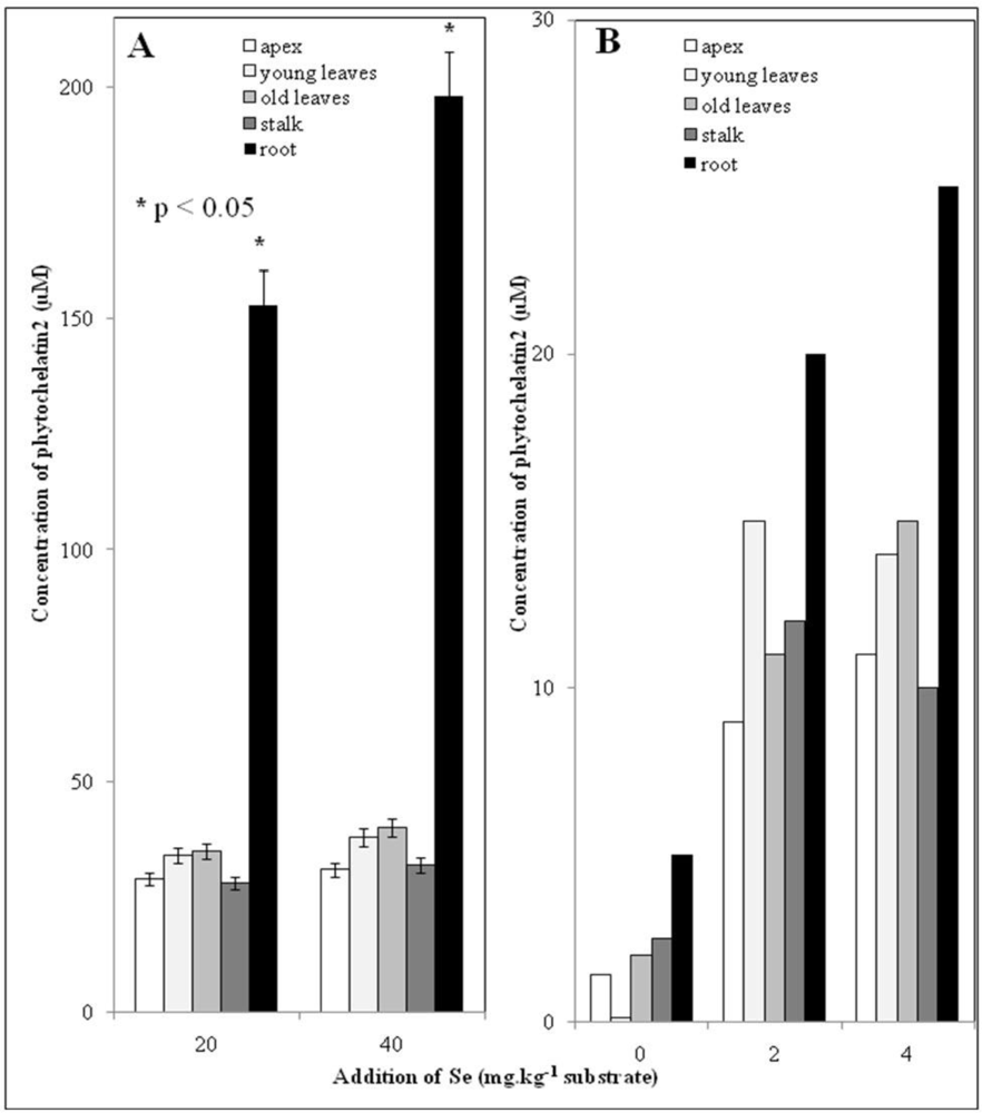 Phytochelatin2 (PC2) content in individual parts (apex, young leaves, old leaves, stalk and root) of nettle plants treated with 20 and 40 mg Se/kg (A); 2 and 4 mg Se/kg (B). Other experimental conditions as described in the Experimental section.