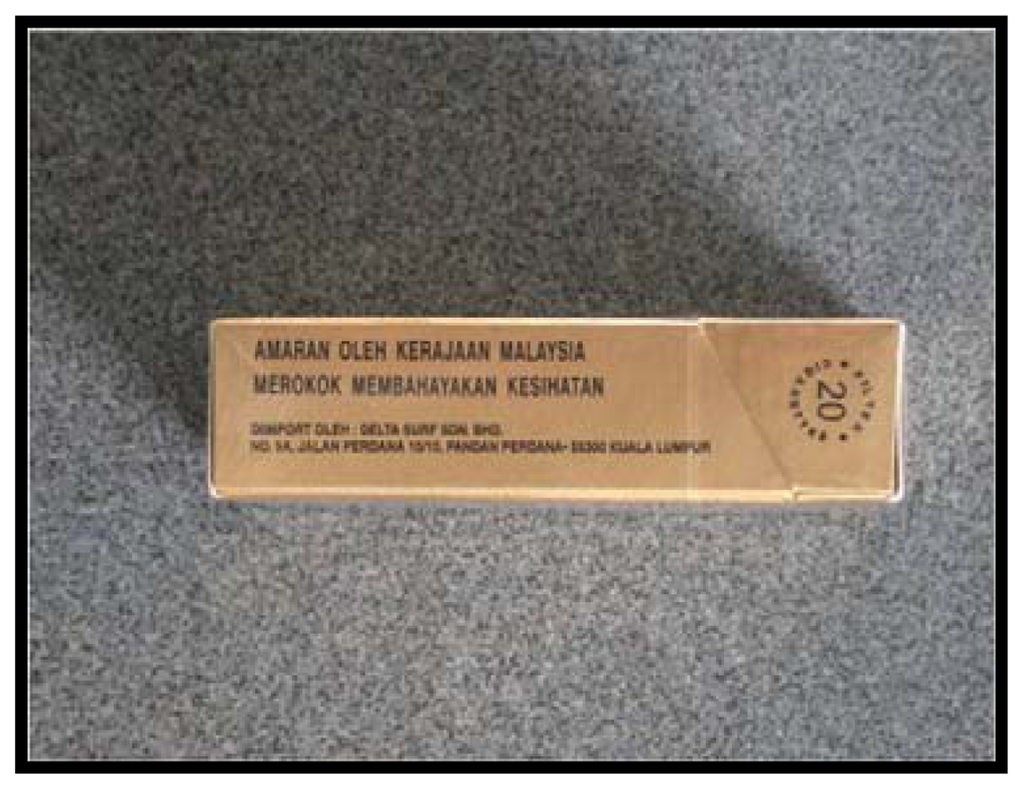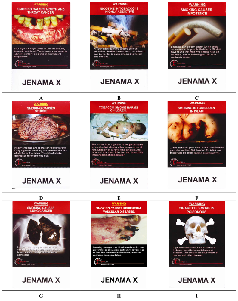 Figure 1 shows the standard pack warning on cigarettes sold in Malaysia before January 2009. The single text-only message stated: “warning by the Malaysian government; smoking is hazardous to health”. Malaysia ratified the World Health Organization’s Framework Convention on Tobacco Control in September 2005, which obligated them to adopt an enhanced tobacco product warning system [16]. Malaysia, like many other countries, adopted a rotating series of graphic pictorial warnings labels beginning in January 2009.