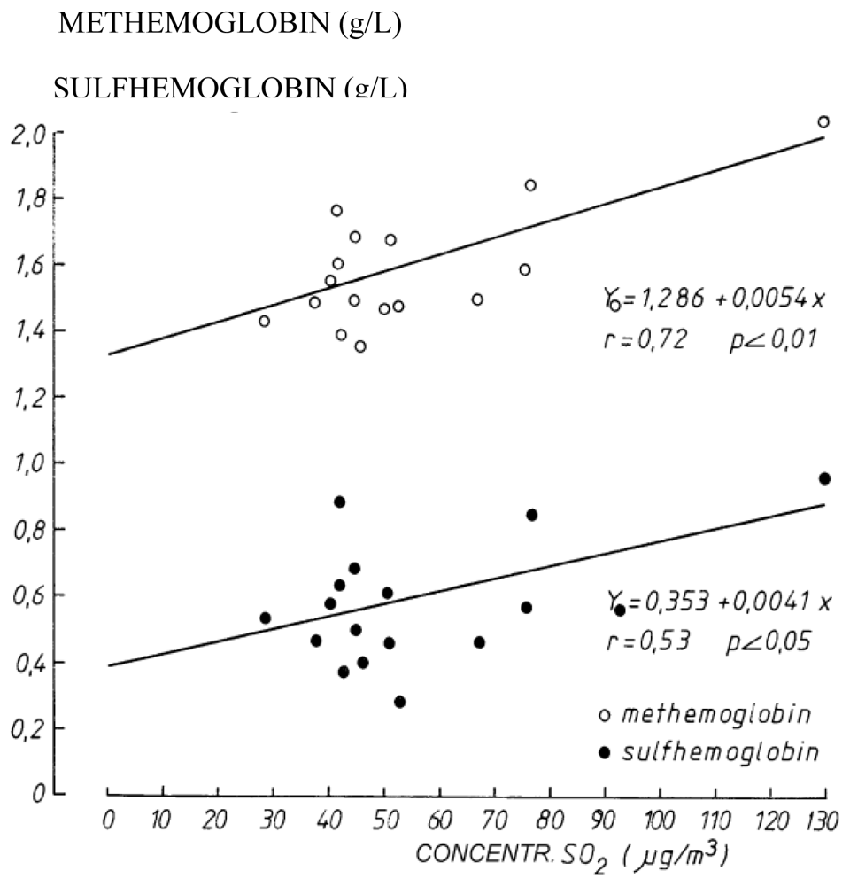 The level of methemoglobin and the sulfhemoglobin in the bloodstream was determined in the laboratory by spectrophotometry on three separate occasions with one month between each test, and for each pregnant woman (N = 122) during the exposure period when the power plant was in operation and for each pregnant woman during the control period when the power plant was closed (N = 138). We found a significant positive correlation between the levels of methemoglobin (a product of inhaled nitrogen compounds resulting from coal combustion) and sulfhemoglobin in the blood of pregnant women and the daily ground-level concentration of sulfur dioxide (r = 0.72, p < 0.01) resulting from coal combustion (