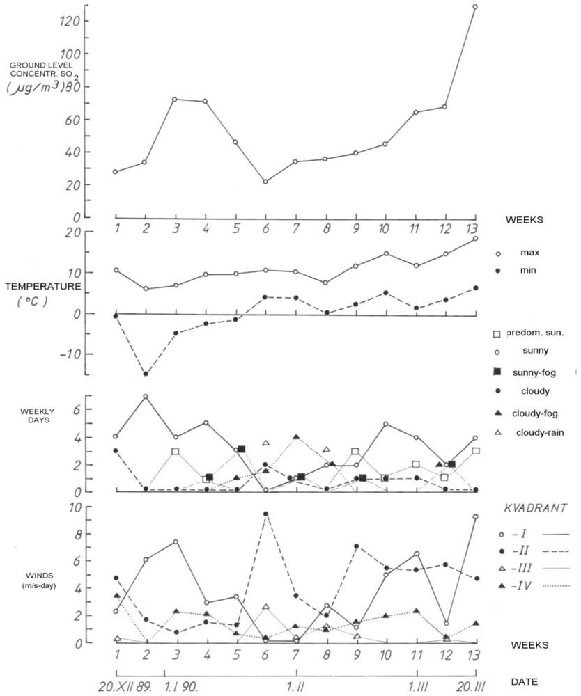 The monitoring of the weather conditions during the “exposure period” (December 1989 to March 1990) revealed that the ground-level concentration of sulfur dioxide was lower when the weather was “mostly cloudy with rain” with humid southeast winds (25.3% of days), while during “sunny and mostly sunny days” (65.0% of days), the ground-level concentration of sulfur dioxide was higher (