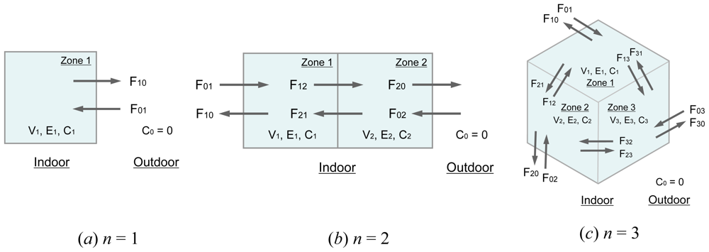 We first considered air change rate measurements in buildings of n fully mixed zones, where n is a natural number. The ventilation situations in buildings with 1–3 zones are illustrated in Figure 1. Measurements aim to determine the volume of air uptake from the outside into the n zones (air change rate). The uptake volume of air, Fuptake, can be represented by the following equation: