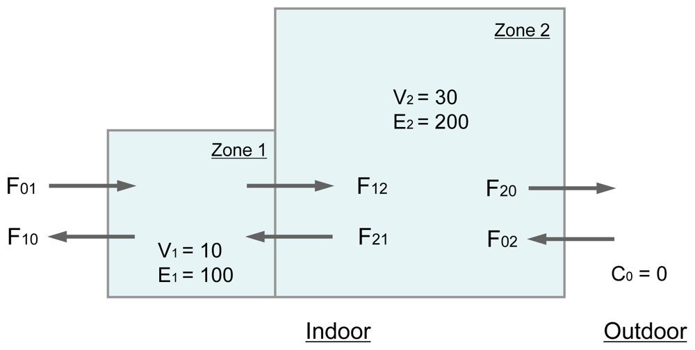 The estimation method can then be illustrated in application to a specific situation. It should be noted that the kind of tracer gas does not affect the results. This method is based on steady state. Thus, that requires constant airflow rates over a sufficient period of time for the concentrations to stabilize. Here, we attempt to simply measure the air change rate of two fully mixed zones. V1 and V2 are assumed to be 10 m3 and 30 m3, respectively. E1 and E2 are set as 100 μg/h and 200 μg/h, respectively. Figure 2 illustrates this situation. In the case, f1(x) − f4(x) were calculated as: