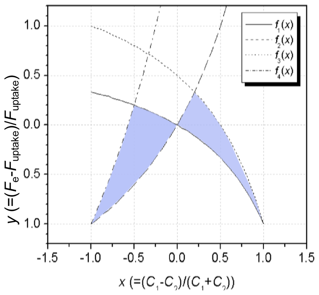 Because Fe and Fuptake are not independent, the range of y is even more limited. A further parameter, x, can be introduced as an indicator of concentration differences between the two zones: