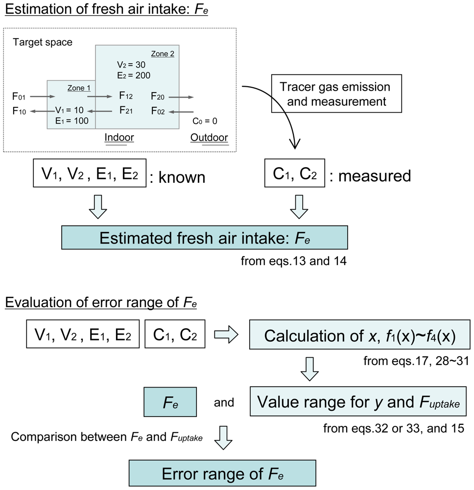It should be noted that Fe can be appropriately normalized in accordance with the aim of measurement. If we want to minimize the error rate, we can choose 25 ± 5 m3/h as Fe (error range is ±20%). To minimize the error rate, E1 and E2 should be set at the same value. In this case, the maximum error range of air intake Fe estimated by the methods is always <33%. This error value is equivalent to that reported by Riffat with single tracer gas measurement [14]. Miller et al. [12] reported that airflow rates in two-zone building could be estimated with an accuracy of 8% by two tracer gas decay experiments with the nonlinear least-squares minimization method in controlled conditions. One feature of this method is its simplicity in calculation operations. As described above, the proposed method can estimate air uptake volume with a practical accuracy only by using four arithmetic operations. If this estimation method can be combined with real time monitoring of a tracer gas concentration, we can extemporarily obtain the estimated air uptake without complex calculations. Furthermore, by using this method, overestimation of air change rate can be easily avoided. When aiming to avoiding overestimation of air change rate, the estimation method can give a minimum air change rate (in this case, Fe,min. = 20 m3/h). Figure 4 summarizes the estimation flow chart for air intake and its error range.