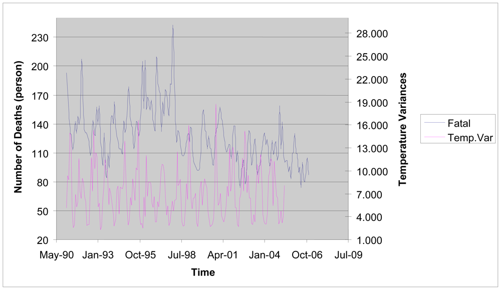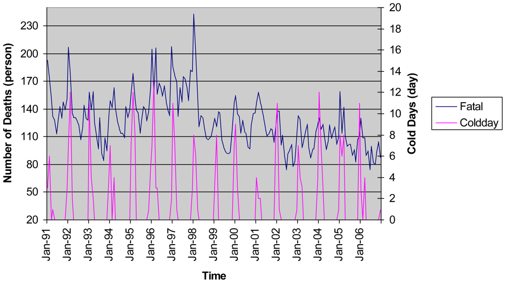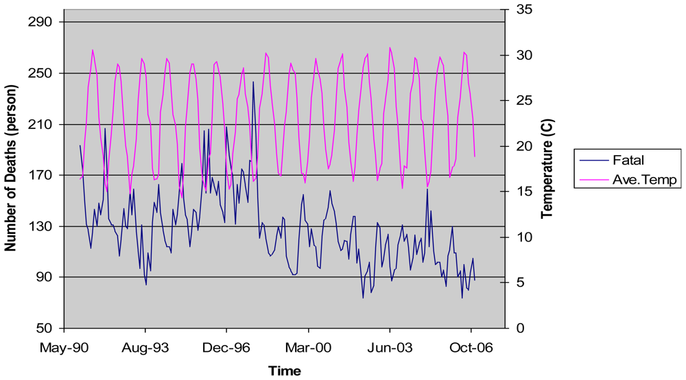- Saez, M; Sunyer, J; Castellsague, J; Murill, C. Relationship between weather temperature and mortality: A time series analysis approach in barcelona. Int. J. Epidemiol 1995, 24, 576–582. [Google Scholar]