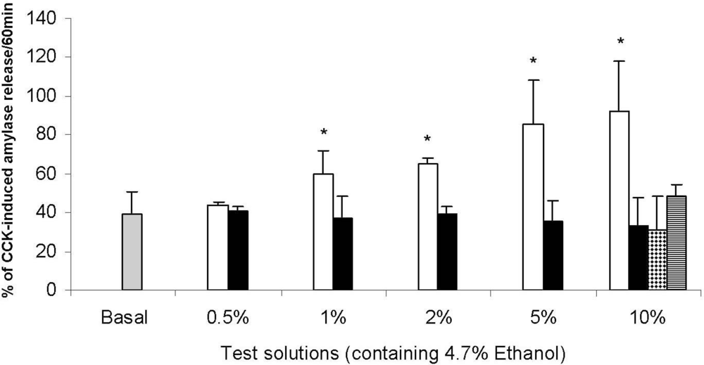 - Hajnal, F; Flores, MC; Valenzuela, JE. Effect of alcohol and alcoholic beverages on nonstimulated pancreatic secretion in humans. Pancreas 1989, 4, 486–491. [Google Scholar]