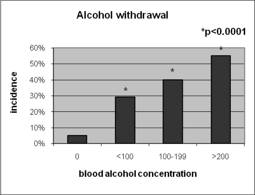 - Bard, MR; Goettler, CE; Toschlog, EA; Sagraves, SG; Schenarts, PJ; Newell, MA; Fugate, M; Rotondo, MF. Alcohol withdrawal syndrome: Turning minor injuries into a major problem. J Trauma 2006, 61, 1441–1445. [Google Scholar]