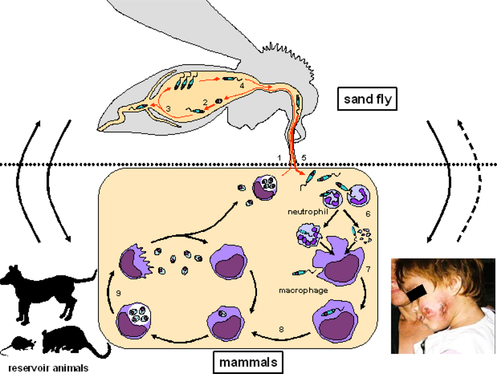 Schematic life cycle of Leishmania parasites. 1. The sand fly ingests amastigotes during blood feeding. 2. Amastigotes transform into promastigotes. 3. Promastigotes colonize and multiply at the hindgut and midgut of the sand fly. 4. Infective promastigotes (metacyclics) migrate to the anterior part of the gut. 5. The infective stage of promastigotes are transmitted to a mammalian host by the bites of the sand fly. 6. Promastigotes invade host neutrophils. 7. Macrophages are infected by promastigotes directly or through the phagocytosis of infected neutrophils, or infected silently by promastigotes released from apoptotic neutrophils. 8. Promastigotes transform into amastigotes. 9. Amastigotes multiply in infected cells by binary fission. Note: Most Leishmania species are maintained by an animal-to-animal transmission cycle and humans are considered an accidental host (arrow). However, anthroponotic transmission without animal reservoirs is also reported in some Leishmania species (dashed arrow).