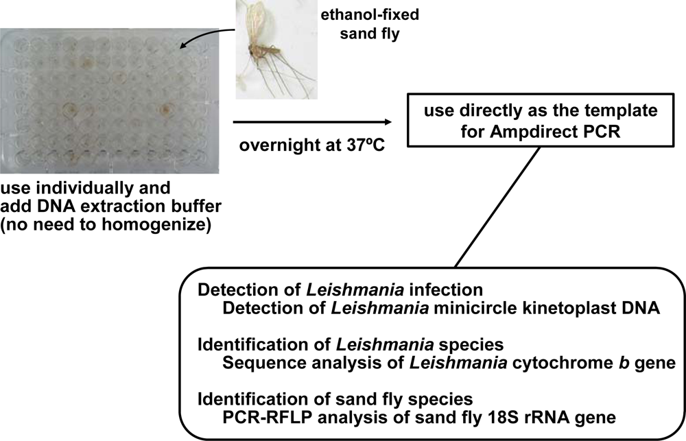 Detection and identification of Leishmania species within sand flies are important for predictions of the risk and expansion of the disease in endemic and surrounding areas since the infected species is the major determinant of the clinical outcome in humans [1–3]. The infection of sand flies with Leishmania promastigotes has been examined by the dissection of individual sand flies under a microscope. For this purpose, specimens need to be fresh, and the dissection of tiny sand flies requires a highly skilled technique. The procedure takes a relatively long time, and additionally, a large number of specimens have to be examined to obtain informative data for each area since the infection rate of sand flies with Leishmania is generally very low (0.01–1%) even in endemic areas [62,63]. To improve on conventional methods, several PCR-based techniques have been developed [45,47,64–73], and infection of Leishmania species within sand flies was identified, e.g., L. (L.) major in P. papatasi [65], L. (L.) infantum in P. major [69] and L. (L.) donovani in P. argentipes [72] in the Old World, and L. (L.) mexicana in Lu. ayacuchensis [45,47] and Lu. ovallesi [66], L. (L.) amazonensis in Lu. longipalpis [67,73], L. (L.) infantum chagasi in Lu. longipalpis [67] and Lu. almerioi [73], L. peruviana in Lu. peruensis [47], L. (V.) naiffi in Lu. tortura [48] and L. (V.) braziliensis in Lu. ovallesi [66], Lu. gomezi [66] and Lu. neivai [70] in the New World. In most studies, DNA was extracted from pooled sand fly samples or from individual sand flies by use of an expensive kit or by a complicated conventional protocol using proteinase K-containing DNA extraction buffer followed by phenol/chloroform extraction and ethanol precipitation. These methods are sensitive enough to detect Leishmania species within sand flies. However, several improvements were desirable for the analysis of a large number of sand flies with less effort and cost. In addition, it is better to analyze sand flies individually because several species co-exist in most endemic areas and the use of pooled samples may spoil important information on vector epidemiology such as the prevalent sand fly species and the relationships between Leishmania and vector species. Recently, a method of mass screening sand flies for Leishmania infection was established, and its usability for field research confirmed [46,47]. The protocol is represented in Figure 3. With this method, 96 individual samples can be analyzed at once with few processes. The method has a number of advantages: 1) purification of DNA is not required; that is, ethanol-fixed sand fly samples lysed in conventional DNA extraction buffer overnight at 37 °C without homogenization can be directly used as PCR templates, 2) the sensitivity and specificity are very high; leishmanial DNA is detectable if only one parasite exists in a sample, 3) data on individual sand flies can be obtained, 4) there is minimum risk of DNA loss and contamination among samples because of few processes, and 5) each sample can be used as a template for 100–150 PCRs. In addition, the sand fly species can be identified by molecular biological methods such as PCR-RFLP using the same template DNA if some genetic information is available on the prevalent sand fly species in the given endemic areas. Further, Leishmania species detected within sand flies can be identified by the analysis of leishmanial genes such as the mitochondrial cytochrome b gene [45–48,74–76]. Thus, application of the mass screening method in different areas will provide important information on risk factors, hopefully leading to the control and/or surveillance of leishmaniasis.