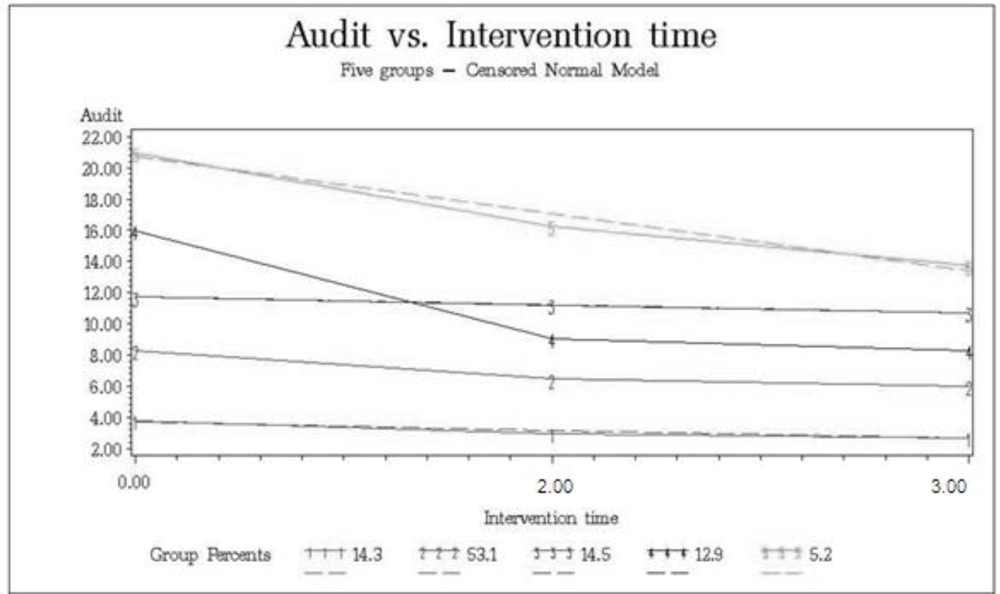 The best-fit models contained five groups for AUDIT, four groups for SIP and three groups for eBAC. The best-fit model for AUDIT is linear for groups 1, 3 and 5, and quadratic for groups 2 and 4. As for SIP and eBAC, all group models are linear.