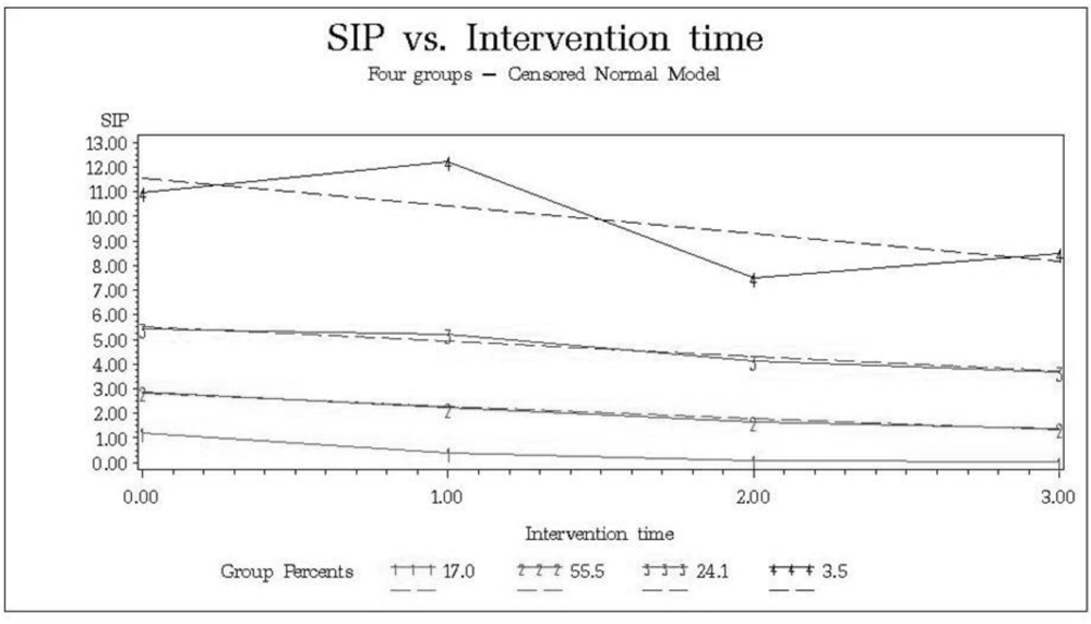 All four groups best fitting the trajectory model and SIP scores across the years decreased their SIP scores. The four defined trajectory groups included stable low (group 1 in Figure 2; 17.0%, with a mean decrease of 3.8 points across the years), stable medium (55.5%, mean decrease 1.3), stable high (24.1%, mean decrease 1.2) and very high decreasing (3.5%, mean decrease 2.3). The high decreasing group showed increases in SIP scores for years 1 and 3, but showed an overall decrease.