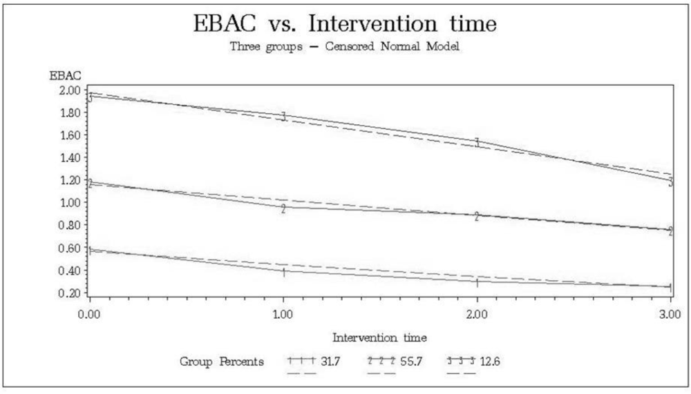 Three trajectory groups were defined for eBAC across time, and all of those groups decreased their eBAC levels with time (Figure 3): low decreasing (group 1 in Figure 3; 31.7%, with a mean decrease of 0.3% across the years), medium decreasing (55.7%, mean decrease 0.3) and high decreasing (12.6%, mean decrease 0.5).