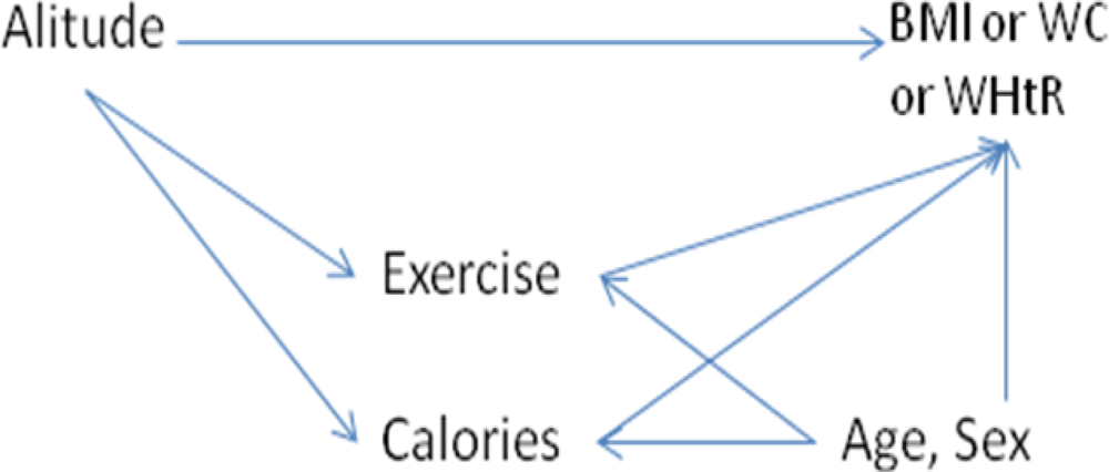 Characteristics and obesity parameters of the subjects by altitude of residence were described in medians and frequencies. The distribution of the outcome variables BMI, waist circumference and waist-to-height ratio were skewed, with long tails to the right. Therefore non-parametric (Kruskal-Wallis) test were used when comparing the BMI, WC or WHtR distributions between groups. Chi-squared method was used for comparing proportion of obese people. Using data from Nepal, multiple linear regressions were used to find the direct effect of altitude on BMI, WC and WHtR individually, and the indirect effect passing through exercise and calorie intake (