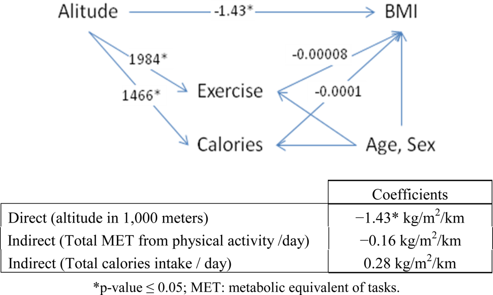 Figure 2 describes the effects of altitude on BMI. The direct effect of altitude on BMI was −1.43 kg/m
