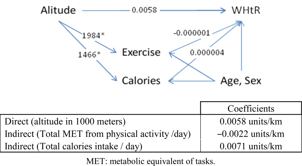 2/kcal, respectively. The indirect effects of altitude on BMI when passed through intermediate variables physical activity and calories were −0.16 kg/m