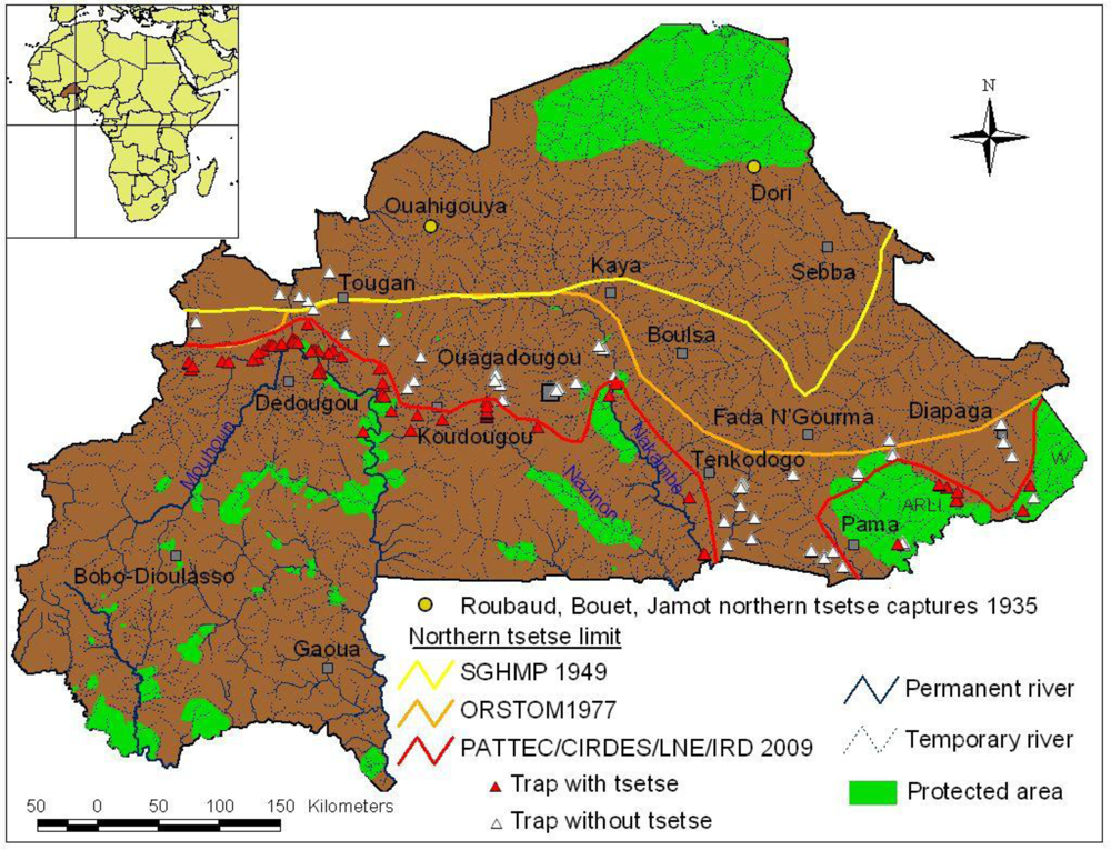 In Burkina Faso, the most recent tsetse distribution map available at the country scale was drawn up by Challier and Laveissière [23]. Taking into account the needs of the national PATTEC program in Burkina Faso (Programme de Création de Zones Libérées Durablement de la Tsé-Tsé, PCZLD), together with recent global changes, the aim of this study – jointly undertaken by PCZLD and CIRDES -was therefore to update the northern tsetse distribution limit in Burkina Faso, to compare the results with previous data recorded more than 50 years ago, and to understand the main causes of the changes of this northern limit. In this paper, we will address the three main tsetse species present in the country: two riverine species belonging to the G. palpalis group (G. palpalis gambiensis and G. tachinoides) and one savannah species belonging to the G. morsitans group (G. morsitans submorsitans).