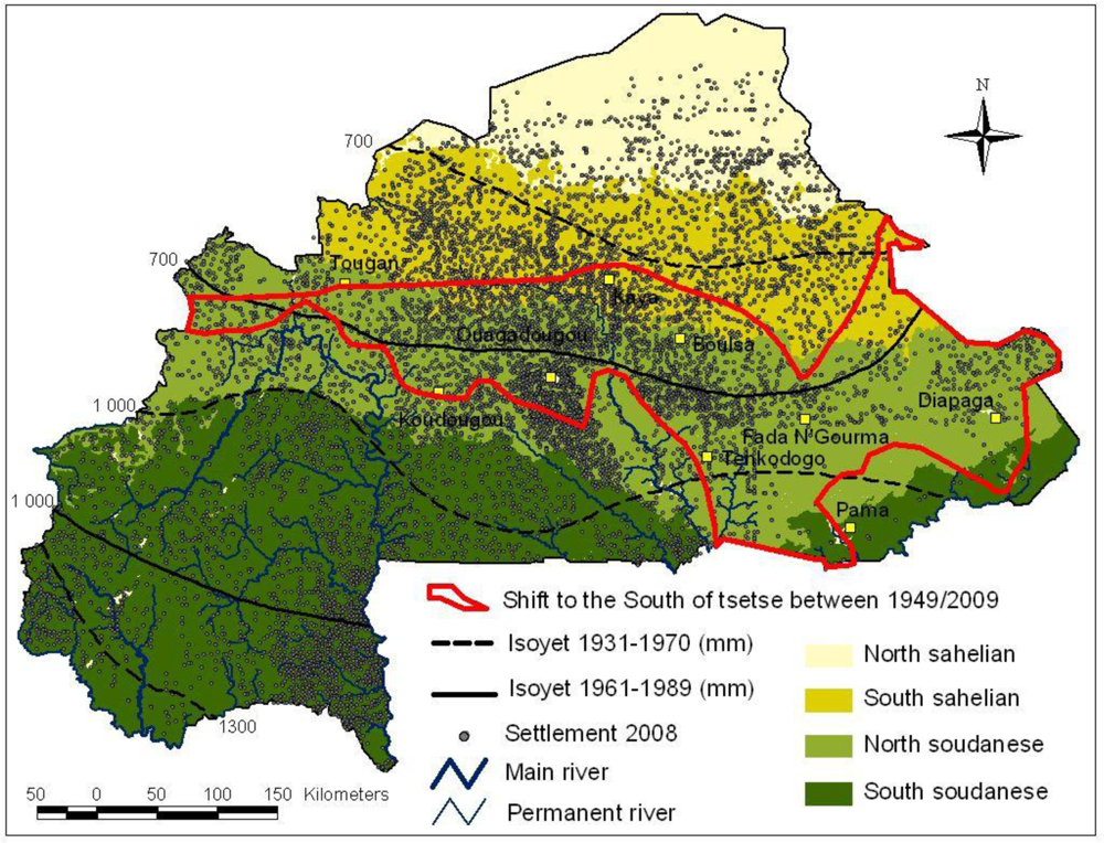North to south shift of tsetse and rainfall, and settlement changes over time in Burkina Faso.