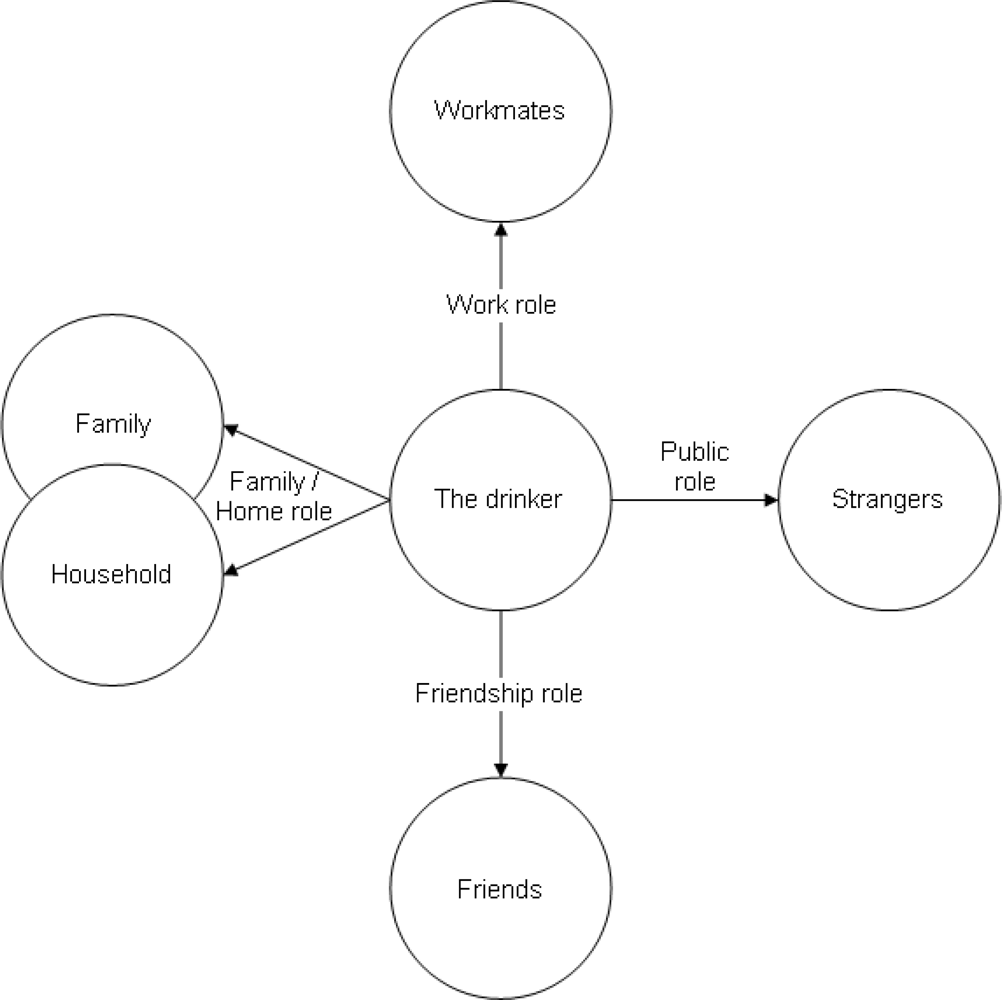 This conceptual paper is written in the context of a study which includes a population survey specifically devoted to measuring alcohol’s harm to others [25]. In the survey, we are asking about the harms to a single person, the respondent, from a range of drinkers. To increase the specificity and validity of the responses, minimising recall bias, we confined the time period to the previous twelve months. Different sections of the questionnaire cover drinkers in different forms of relationship with the respondent. The domains of relationship covered in the study are those of Figure 1. But the survey’s approach is from the perspective of the other, rather than the drinker. The respondent is asked about adverse effects on him or her from drinkers in each of the role relationships shown in Figure 1.