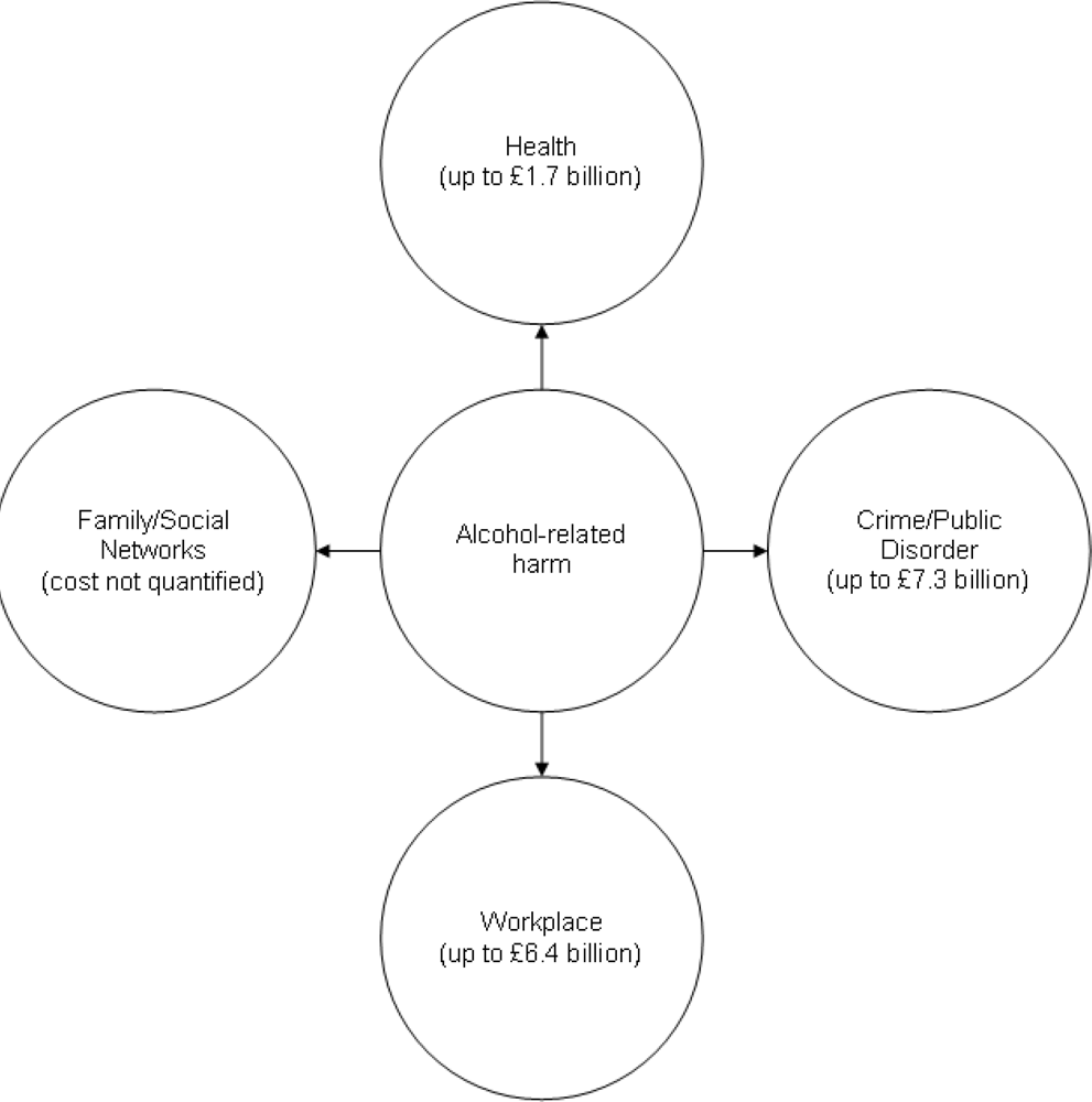 These results underline a point made in the cost of alcohol study for England and Wales [33]. The study divided the main social costs into four categories: health; crime/public disorder; workplace; and family/social network (Figure 2). Although it was able to quantify costs only for the first three categories, it insisted on noting the fourth as an important category.