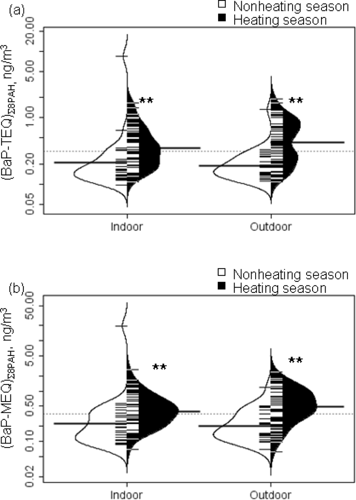 Seasonal variations in (a) (BaP-TEQ)∑8PAH and (b) (BaP-MEQ)∑8PAH.Note: Mann-Whitney test was performed to compare heating season and nonheating concentrations (BaP-TEQ)∑8PAH and (BaP-MEQ)∑8PAH indoors and outdoors. The white and black lines show individual observations, while the white and black area shows the distribution. The dotted line indicates the overall geometric mean and the thicker solid line shows the geometric mean concentration of indoors and outdoors for each season. Mann-Whitney test, **p<0.001. ∑8PAH includes benz(a)anthracene (BaA), chrysene/iso-chrysene (Chry), benzo(b)fluoranthene (BbFA), benzo(k)fluoranthene (BkFA), benzo(a)pyrene (BaP), indeno(1,2,3-c,d)pyrene (IP), dibenz(a,h)anthracene(DahA), and benzo(ghi)perylene (BghiP).