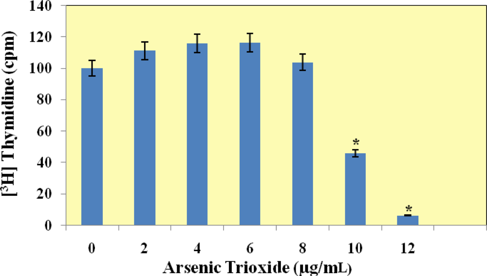 Historically, cell proliferation assays relied on the detection of tritiated thymidine [3H] uptake. The thymidine incorporation assay measures the inhibition of deoxyribonucleic acid (DNA) synthesis by the proliferating cell population following exposure to a drug or chemical. In the present study, we demonstrated that arsenic trioxide affected DNA synthesis in colon cancer cells (HT-29). Data obtained from the [3H]thymidine incorporation assay exhibited a biphasic response to arsenic trioxide in the colon cancer cells. The data from this study reveals that arsenic trioxide inhibits cellular proliferation at higher doses (i.e., 8 and 10 μg/mL). This result is consistent with preliminary studies in our laboratory that revealed a biphasic response to arsenic trioxide in the breast carcinoma (MCF-7) cell line. Studies have shown that arsenic trioxide is acutely toxic to both breast carcinoma (MCF-7) and lung carcinoma (A549) cell lines [44]. Arsenic trioxide has been shown to significantly enhance growth inhibition in human breast cancer MCF-7 cells determined by the MTT [3-(4,5-dimethylthiazol-2-yl)-2,5-diphenyltetrazolium bromide] assay and [3H]thymidine incorporation assay [45]. Hamadeh et al. demonstrated that the incorporation of [3H]thymidine was markedly increased, relative to the control levels in arsenite-exposed keratinocytes indicating an increase in cell proliferation [46]. Germolac et al. reported that human keratinocytes, treated with sodium arsenite resulted in a significant increase in cell proliferation as indicated by the incorporation of [3H]thymidine into cellular DNA [47]. Trouba et al. reported an increase in cell proliferation observed in human fibroblasts exposed to sodium arsenite [48]. Lee et al. showed that arsenic trioxide alone slightly inhibited the growth of HCT116 colon cancer cells, whereas the combination of arsenic trioxide and sulindac reduced cell growth by 30–40% [49]. Data in this study reveal that arsenic trioxide increases cellular proliferation in human colon cancer cells as measured by [3H]thymidine incorporation. These observations confirm the effects of arsenic on cell proliferation in keratinocytes, fibroblasts, human breast (MCF-7), and HCT116 colon cancer cells.