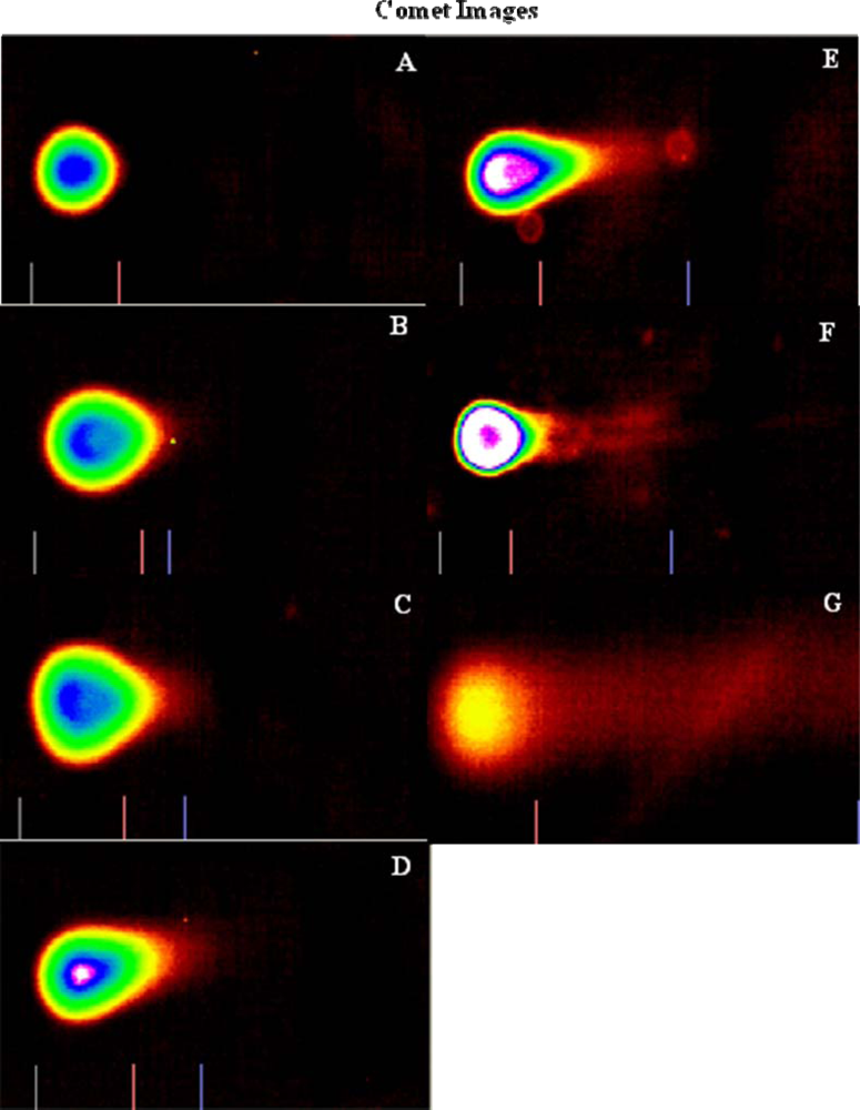 Representative comet assay images depicting the genotoxic effect of arsenic trioxide-treated (A = 0 μg/mL, B = 2 μg/mL, C = 4 μg/mL, D = 6 μg/mL, E = 8 μg/mL, F = 10 μg/mL, and G = 12 μg/mL) colon cancer cells exposed for 24 h using SYBR® green staining.