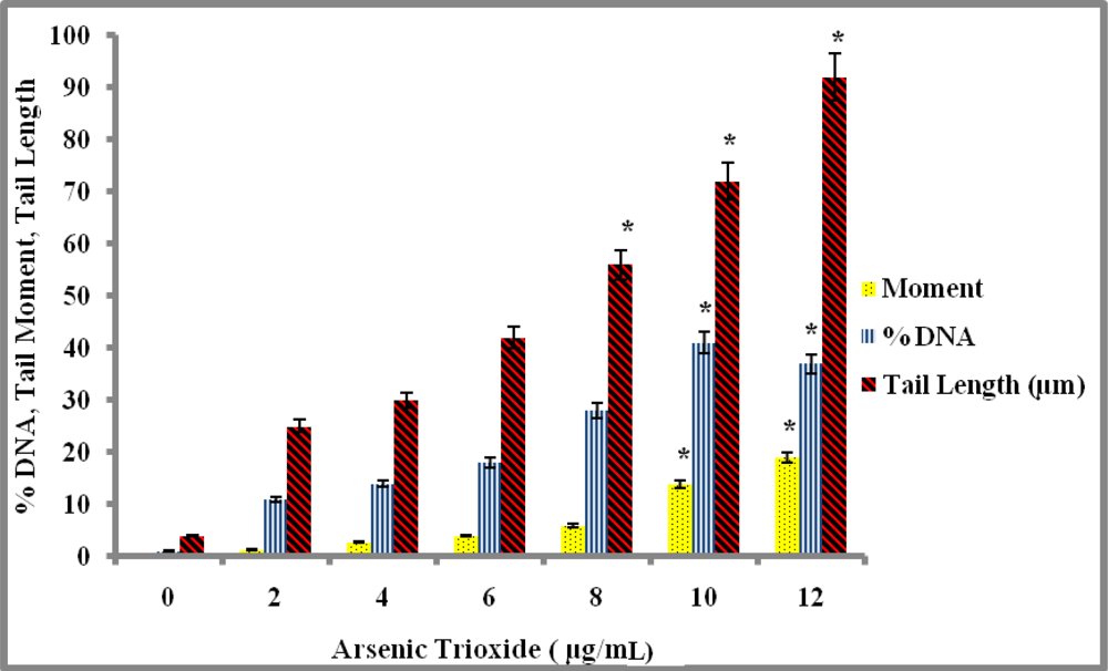 Studies have shown that arsenic trioxide is highly cytotoxic and genotoxic to human leukemia (HL-60) cells. These studies using the comet assay showed that arsenic trioxide induced DNA damage in a dose-dependent manner [43]. Graham et al. showed that arsenic was highly genotoxic to human keratinocytes, melanocytes, and dendritic cells [25]. The data showed a statistically significant dose-related increase in percentage of tail DNA. Studies have shown that arsenic-induced DNA damage in human hepatocytes measured by the comet assay [51]. Genotoxic studies have reported that arsenic trioxide induces DNA damage in lymphocytes [4]. Guillamet et al. have reported DNA damage in the human lymphobastoid cell line (TK6) by the alkaline Comet assay [52]. Several studies have implicated oxidative stress and free radical formation as important factors in the genotoxicity and cytotoxicity of arsenic compounds [8,9]. Arsenic trioxide exerts its effects mainly through elevated oxidative stress, but the exact molecular mechanism remains elusive. Reactive oxygen species (ROS) such as hydrogen peroxide, superoxide anion, singlet oxygen, and hydroxyl radical can directly or indirectly damage cellular DNA and protein [9].