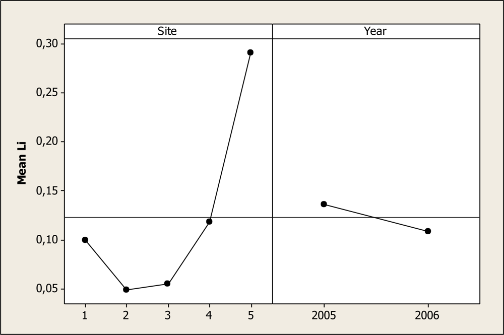 Lithium concentration was different as a function of year (P = 0.037) and location (P = 0.028) and the maximum level of this element was found in locations 1 and 5 (Figure 10). In addition, it was noticed that the Li concentration was higher in the 2005 samples. In another study carried out in the Conchos near Ojinaga, Holguin et al. [25] found levels of Li similar to the results reported here. These researchers noted levels of Li in a range of 0.06 mg L−1 in the June sample and 0.13 mg L−1 in the April samples. Our results showed a Li peak in December with concentration as high as 0.28 mg L−1 which concurs with the results reported by Gutierrez et al. [1] of 0.33 mg L−1 in water sampled from other tributaries of the Conchos River. This element may be a major ecological risk in the water of the Conchos River when considering that some levels are higher than 0.04 mg L−1 and may be toxic to some aquatic insect larvae [45].