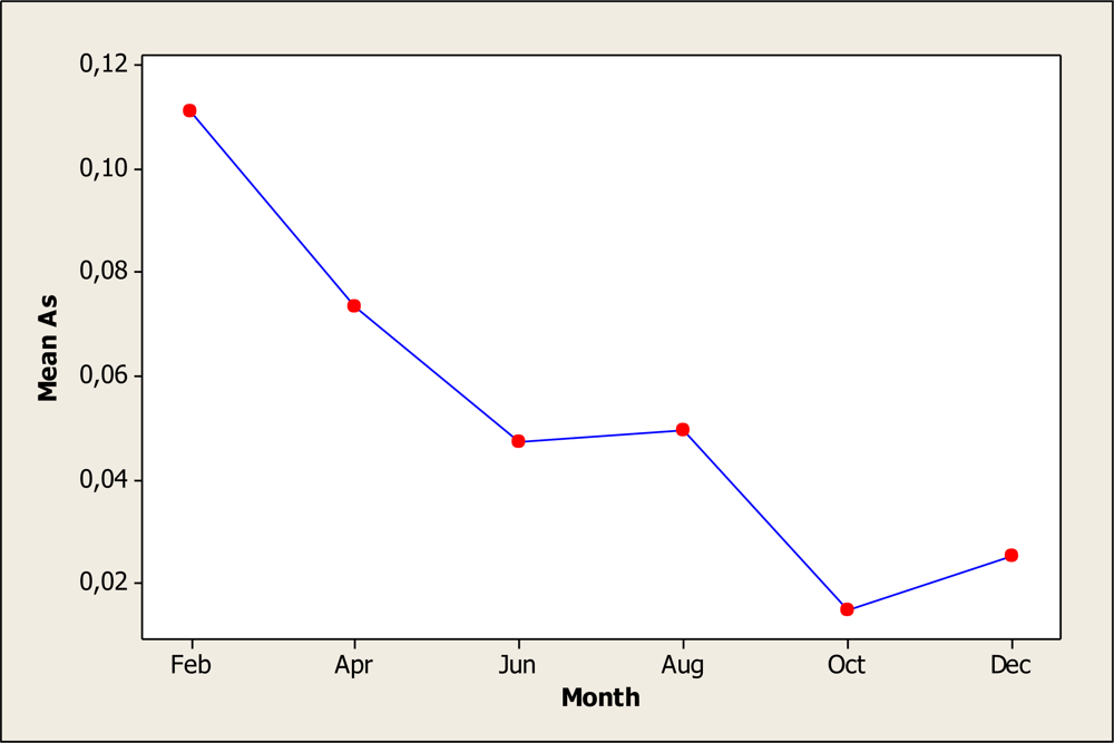 Month effect for arsenic in water samples during the period of 2005–2006.