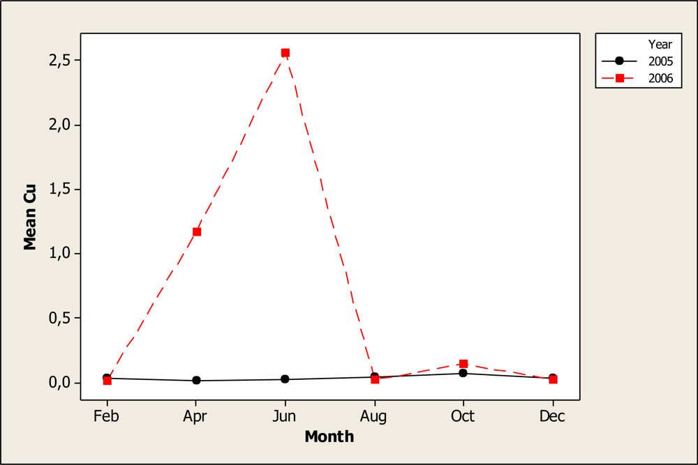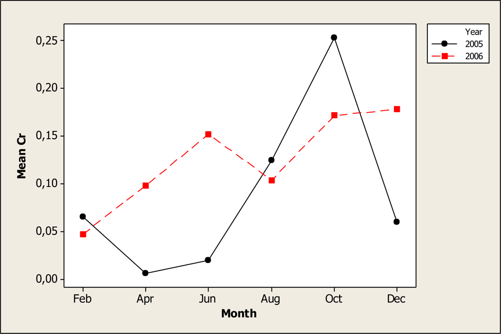 The ANOVA detected differences in Cr levels as a function of sampling month (P < 0.001) and for the year-month interaction (P < 0.001). Figure 3 shows that a higher level was noted in the 2005 October samples with about 0.25 mg L−1, while the lowest concentration was observed during the April and June samplings in 2005. Location 1 gave the highest Cr value of 0.11 mg L−1, followed by location 2 and 3 with 0.10 mg L−1, while the lowest level was noted in location 4 with 0.08 mg L−1. We must point out that Cr may accumulate in freshwater fish [33] and so the fish caught in the Conchos River may be a potential health hazard for inhabitants of the area.