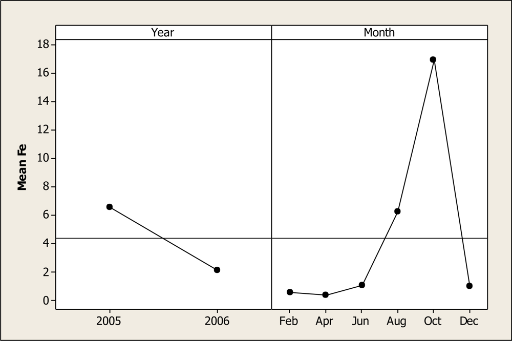 The ANOVA for Fe concentration showed statistical differences as a function of year (P = 0.030) and month (P = 0.003) but no differences were noted for location or the interactions. This main effect is shown in Figure 5 where maximum Fe concentrations were noted in the October samples with approximately 16.36 mg L−1 and the August sampling with 7.0 mg L−1. With respect to year concentration, maximum levels of this element can be seen when noted in 2005 samples. It is understood that aquatic insects may suffer some toxicity at Fe concentrations of 0.320 mg L−1 and the lethal concentration in fish ranges from 0.3 to 10 mg L−1 of Fe [35,36]. The results of this study are higher than these values, meaning that the river ecosystem habitat is being negatively impacted.