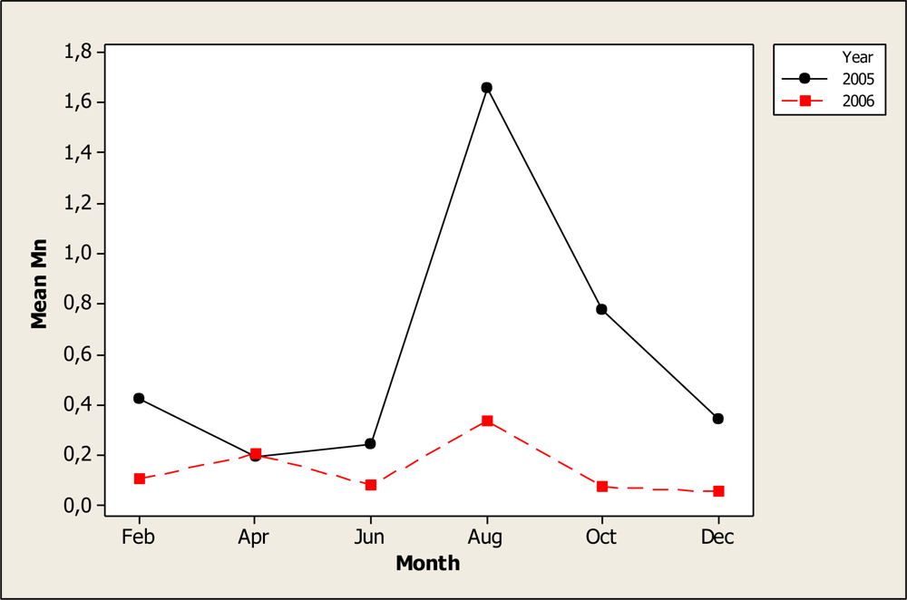 The ANOVA element in regard to Mn, noted statistical differences for year (P < 0.001), month (P = 0.004) and the interaction year-month (P = 0.042) as shown in Figure 6. As evident, maximum Mn levels were noted in the August-December samples. In the location 1 the samples noted 0.56 mg L−1. In our study, a wide range of this element was observed that agreed with the findings of Schlenker et al. [37] who reported on water well samples values from < 0.001 mg L−1 to 0.164 mg L−1. It is interesting to point out that the Mn absorption is inversely associated with Fe levels that were discussed in the last paragraph [38]. Therefore, it is important to suggest further studies in the Conchos area that considers both elements.