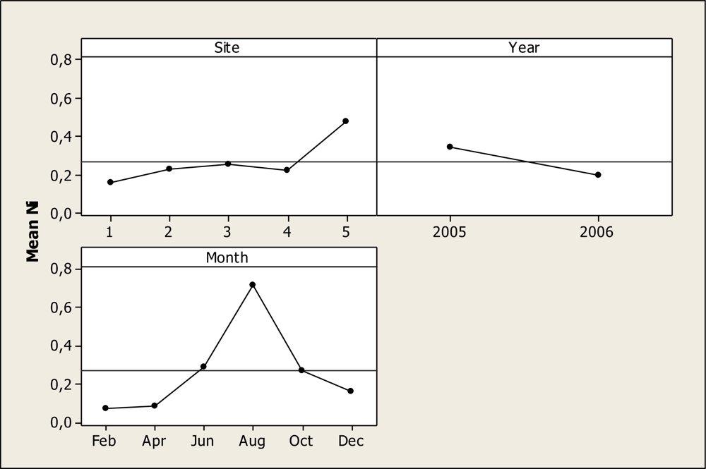 Main effects plot for Ni in water samples during the years of 2005–2006.