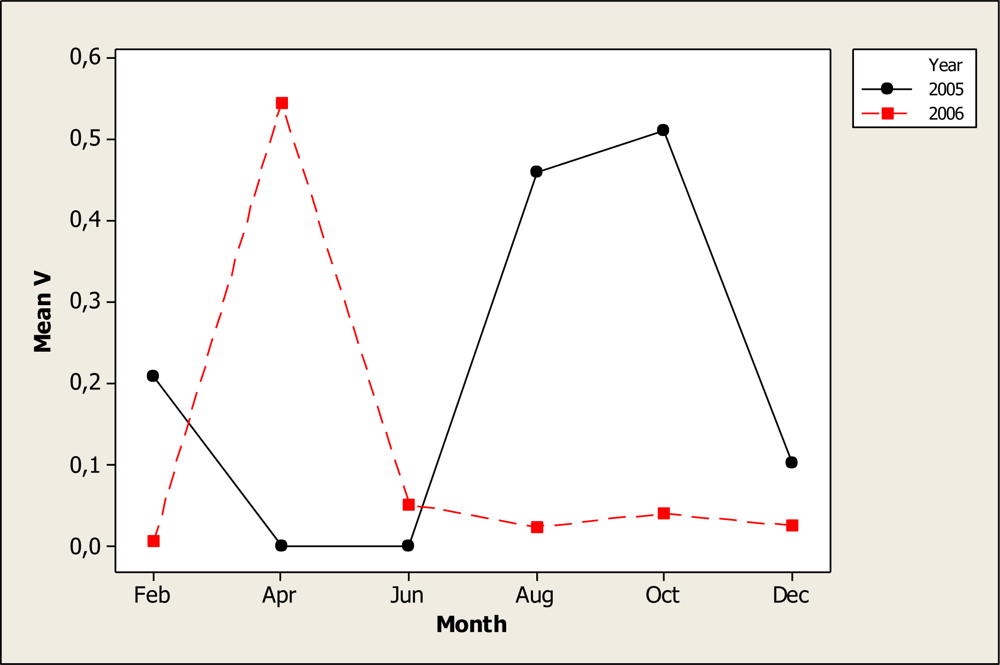 The V concentration was statistically different for year (P < 0.001), month (P < 0.001) and for the interaction year × month (P < 0.001) but no differences were discovered for location and the other interactions. Figure 8 shows that the highest level of this element was noted in 2005 during the April sampling and in 2006 during the August and October samples. The mean concentration for location was similar, in a range of 0.14 mg L−1 in the location 2 to 0.17 mg L−1 in the location 1. V is located mostly in the kidneys, lungs and bones but the total amount of this element in the human body is estimated to be less than 1 milligram. Even though V is considered as an essential element [40], its specific function in the human metabolism is uncertain.