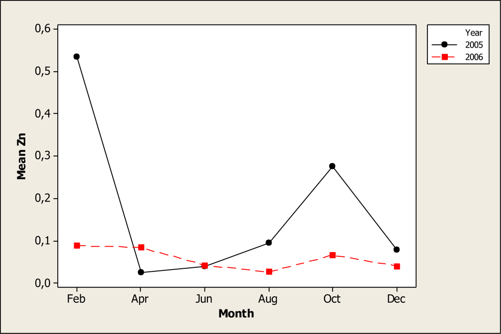 For Zn, the ANOVA detected significant differences in year (P < 0.001), month (P < 0.001) and the interaction year X month (P < 0.001). Figure 9 shows a consistent concentration during both years, with the exception of water samples collected during February 2005, when a peak occurred and a sharper peak again in the October samples. The mean of Zn in the locations varied from 0.08 mg L−1 in location 4 to 0.15 mg L−1 in location 1 samples. At this particular point, the level was higher than the threshold level recommended for aquatic organisms of 0.12 mg L−1 [41]. We must point out that Zn is considered an essential element for aquatic organisms [42], but it can be toxic to aquatic life in high concentrations [43] and can damage the pancreas and kidneys in humans [44].