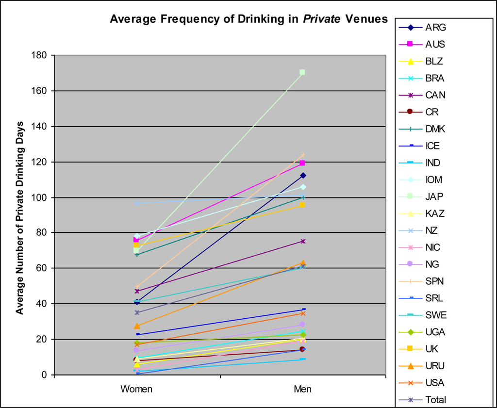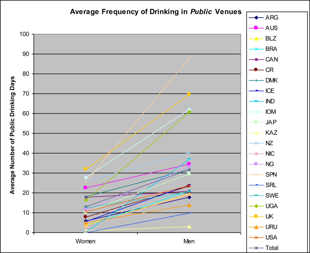 From a public health perspective, drinking in public settings, especially bars, may be a key alcohol behavior to monitor and understand since drinking in public settings is often associated with specific negative consequences for both males and females []. In U.S.-based studies, drinking in public, on-premise locations such as bars and taverns is associated with heavier drinking patterns [–]. It has been proposed that such settings provide cues and social learning mechanisms that reinforce heavy drinking [,]. In addition, a recent study found that consuming the largest amount of alcohol in bar settings compared to home was associated with increased alcohol-related consequences, controlling for overall alcohol volume and frequency []. In North America, for example, drinking in bars and particularly certain types of bars has often been found to be associated with elevated risks of alcohol problems including aggression [,], sexual risk taking [], other drug use [] and most especially drunk driving []. Bar patronage may be associated with problems in other countries too (e.g., South Africa []). Generalizations from the individual to the ecological level are subject to the atomistic fallacy []. However, the consistency of findings regarding increased levels of drinking and harms associated with drinking in public settings suggests that characterizing countries based on the level of drinking in public settings may be important in understanding geographic variation in alcohol-related behavioral risks. Here, we focus on frequency of drinking by venue type; exploring the relationship between level of drinking in public settings and harms is beyond the scope of this analysis. However, because of the relationship between drinking level in different settings and harms for men and women, while an important topic [], we briefly review the public health rationale for examining gender in relation to drinking context, considering how this might affect harms.
