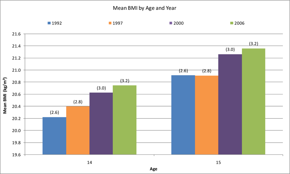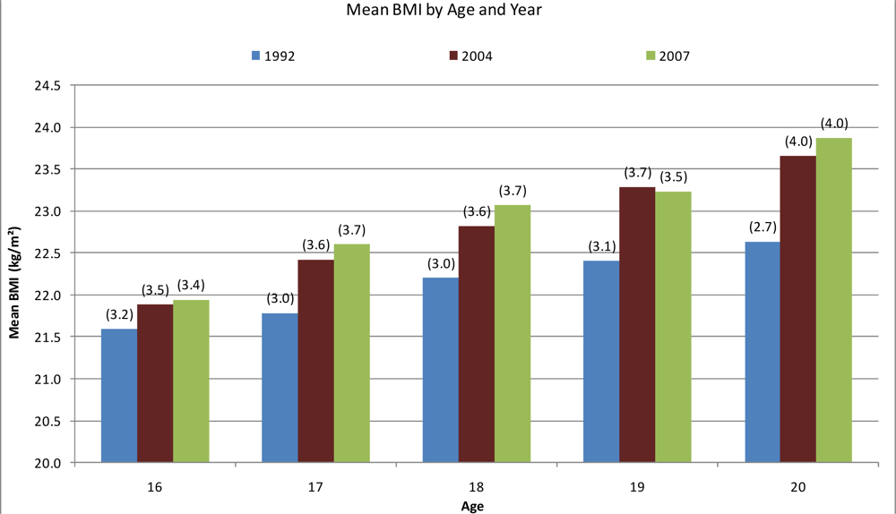 Mean BMI increased consecutively over the study period for both genders across all age groups. As shown in Figures 1 and 2, the increase was most profound among 17- to 20-year-olds. Mean BMI for both 14- and 15-year-olds increased by 0.5 kg/m2 from 1992–2006 as shown in Figure 1. The same trend was observed among16- to 20-year-olds. From 1992 to 2007, average BMI increased between 0.4–1.2 kg/m2 respectively, for the 16-, 17-, 18-, 19- and 20-year-olds. The biggest increase was found in the oldest age group.